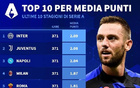 北京时间3月21日,德转统计出了意甲近10年的场均积分排名,国际米兰以2.09分位列第一,尤文图斯2.08分第二,那不勒