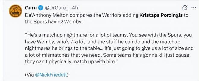 梅尔顿谈到新援珀金:波尔津吉斯是很多球队的对位噩梦,正如马刺队的文班亚马一般,这两人都是7尺多的身高,兼具尺寸与投射,我们会有大量的错位优势,联盟很多球队根本防不住他,这就是纯粹的身体天赋碾压。