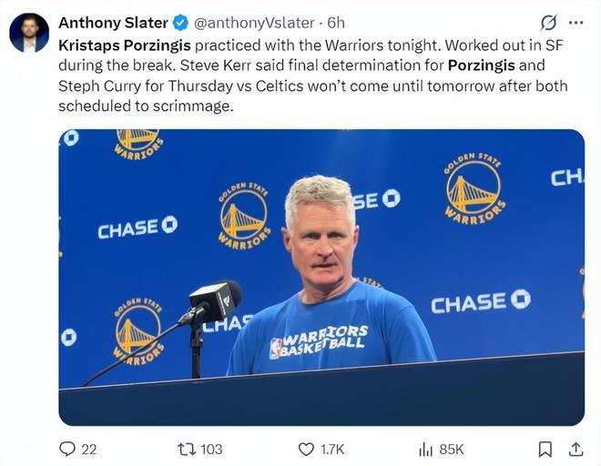 北京时间2月18日,科尔在采访中透露波尔津吉斯的近况,他说道:在整个全明星周末期间,珀金都在旧金山训练,他是否出战对阵凯尔特人的比赛还要看明日的情况,波尔津吉斯已经完成过3V3、5V5的对抗训练。库里也将归队,届时这两人都会参与球队的对抗赛。