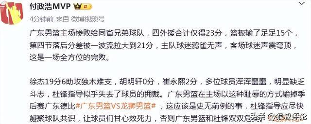 徐杰19分6助攻独木难支,胡明轩0分,崔永熙2分,多位球员浑浑噩噩,明显缺乏斗志,杜锋指导似乎失去了球员的拥戴。广东男篮在主场以这种耻辱的方式输掉季后赛广东德比,这应该是史无前例的事,杜锋指导应尽快凝聚球队共识,让球员们甘心效死力,否则广东男篮和杜锋双双危矣。