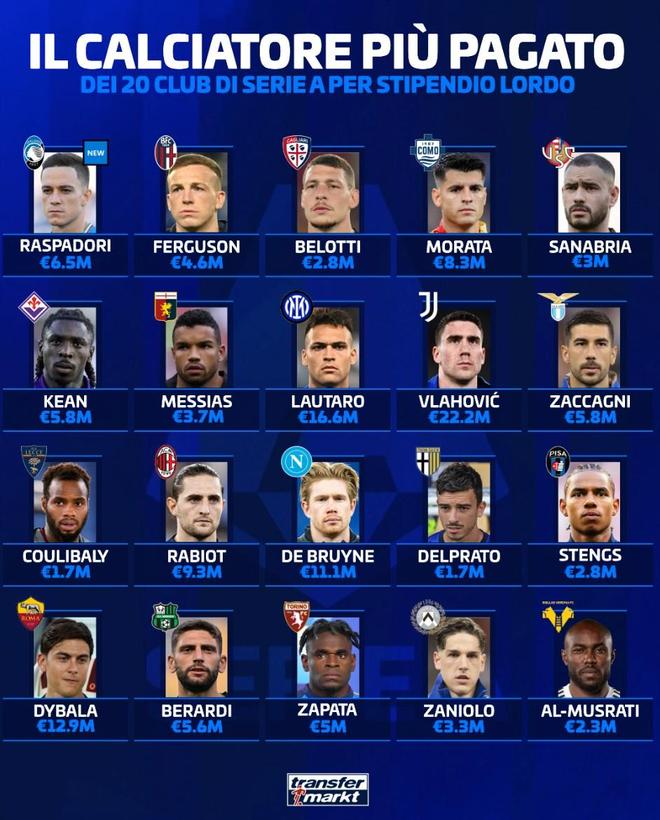 意甲20家俱乐部队内顶薪: