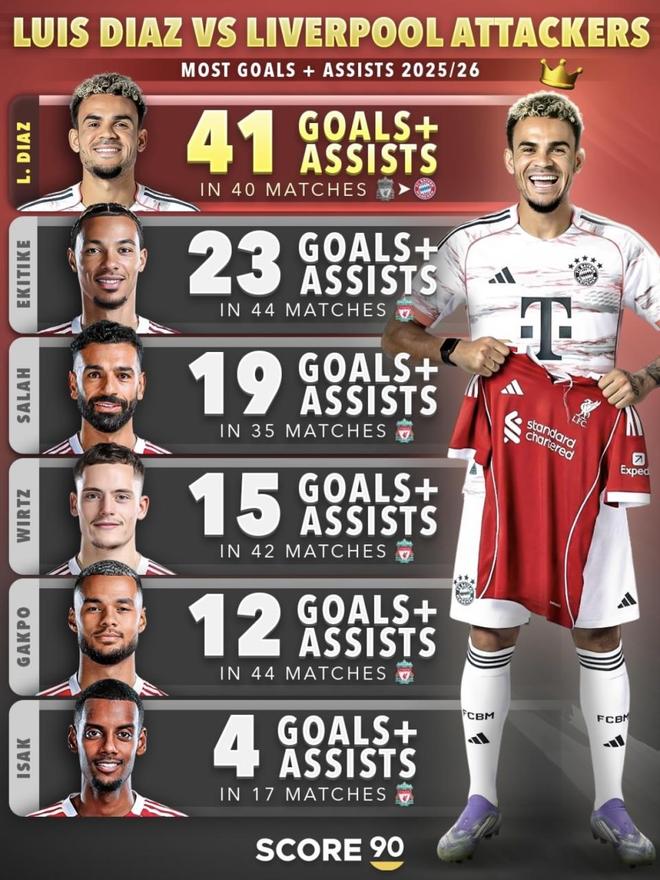 路易斯·迪亚斯在拜仁的首个赛季,直接把个人数据提升到了生涯新高。40场比赛23个进球和18次助攻,总共直接参与41个进球。把这个数据放到同一批前场球员里去对比,差距非常直观:埃基蒂克44场参与23球,萨拉赫35场参与19球,维尔茨42场参与15球,加克波44场参与12球,伊萨克17场参与4球。无论是看总数,还是比单场效率,迪亚斯都和其他人拉开了明显的差距。拜仁官方确认,迪亚斯是在2025年7月从利物浦加盟,合同签至2029年。(数据截至北京时间2026年4月10日)