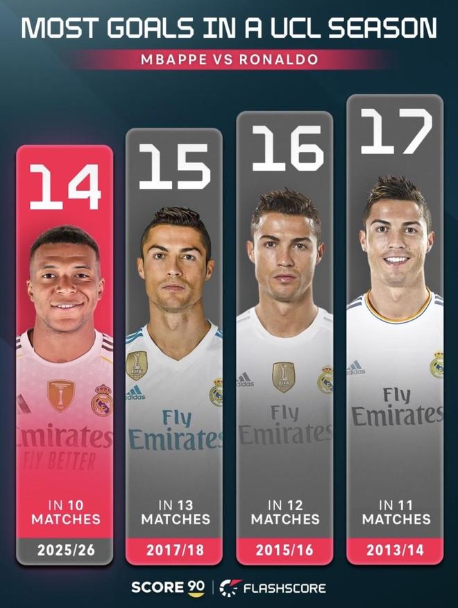 单看进球数,姆巴佩离纪录确实很近。10场14球,这早就不是一般的高产,而是直接杀进了欧冠历史最顶级的单季进球区间。欧足联数据显示,姆巴佩这赛季在欧冠已经有52脚打门,外加1次助攻,说明他的进攻参与度极高,绝不是靠某几场比赛集中爆发刷出来的数据。回看C罗当年11场17球的表现,无论是效率还是总数都压到了极致。姆巴佩现在就差3球,看似一步之遥,但要追的可是欧冠历史最高级别的纪录。