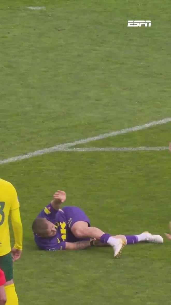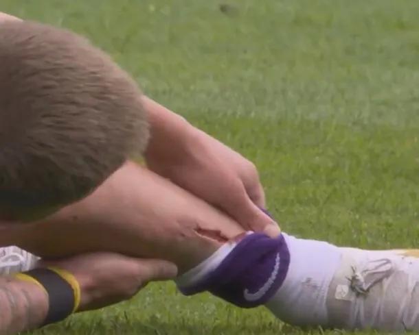 上半场比赛第34分钟,霍尔特比被踢后倒地,随后镜头中可以看到,他的小腿出现一道长长的血口,之后霍尔特比被换下场。
