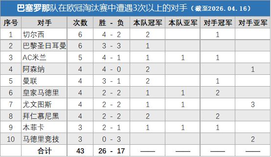 VS拜仁慕尼黑:上赛季以前,对于巴塞罗那来说,几乎是谈拜仁色变。结果一看淘汰赛对战成绩,居然平分秋色。巧合的是,两队各自战胜对手的两次,都成了最后的冠军,可谓最有含金量的对手。