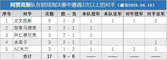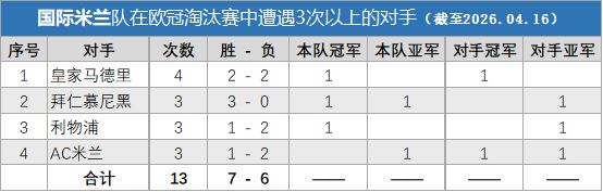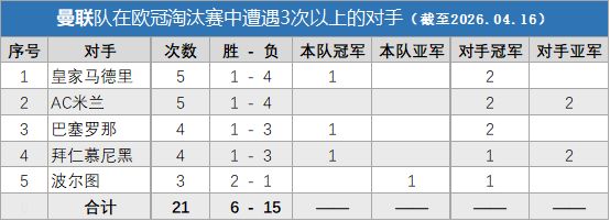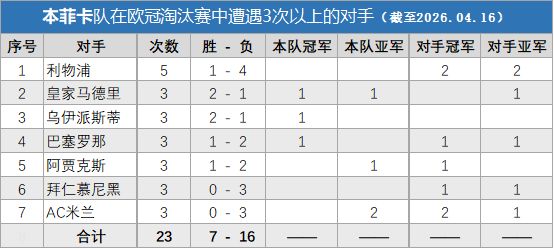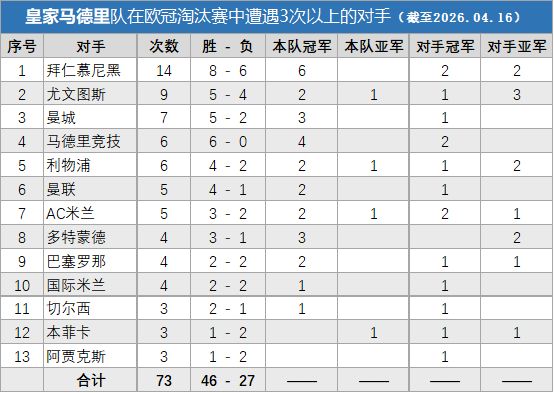 能在与榜单中这些球队多次交手而不落下风,这些数据完美诠释了一支四夺欧冠的球队的历史。